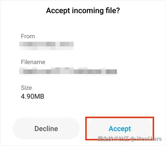 您的 Android 手机上将会弹出一条通知。点击“接受”即可接收文件。