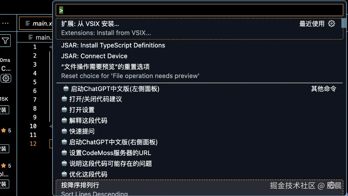 Ctrl + Shift + P,输入Extensions: Install from VSIX...,选择下载的安装包完成安装。