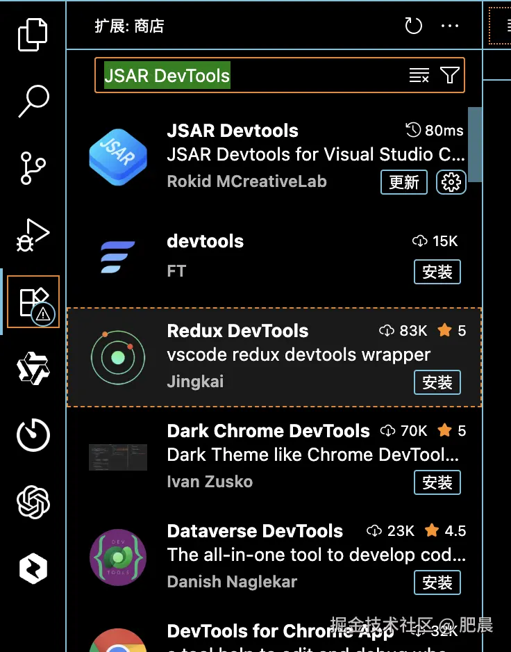 打开 VS Code 拓展面板,搜索 JSAR DevTools(插件 ID:RokidMCreativeLab.vscode-jsar-devtools),点击安装即可。