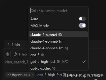 Cursor的性价比还算不错,ide的使用体验优化得很好。支持各种大模型,日常使用推荐claude-4-sonnet thinking,最好开启max mode模式,加载更多的上下文窗口,另外有一个使用技巧,当claude-4-sonnet thinking一直反复解决不了的bug,推荐切换到gpt-5-high-fast模型,会有意想不到的效果