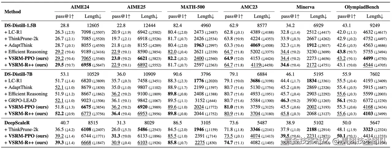 在数学问题最常用的 Benchmark 上,使用三个不同 Base Model,两种 RL 算法,将 VSRM 与多种最新的相关工作进行对比,实验结果展现出 VSRM 在降低输出长度的同时,能够最大限度地保持性能,取得很好的均衡。