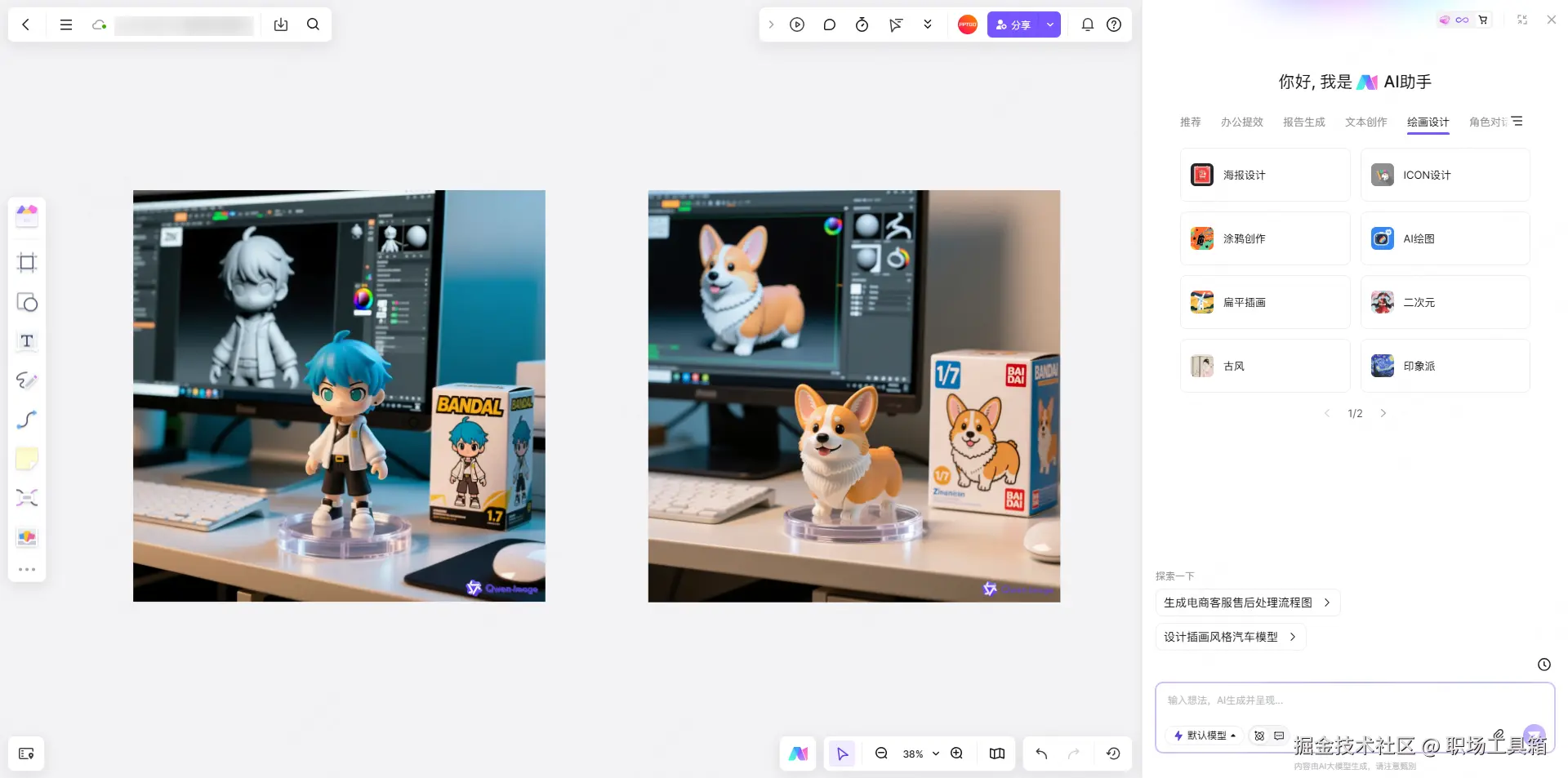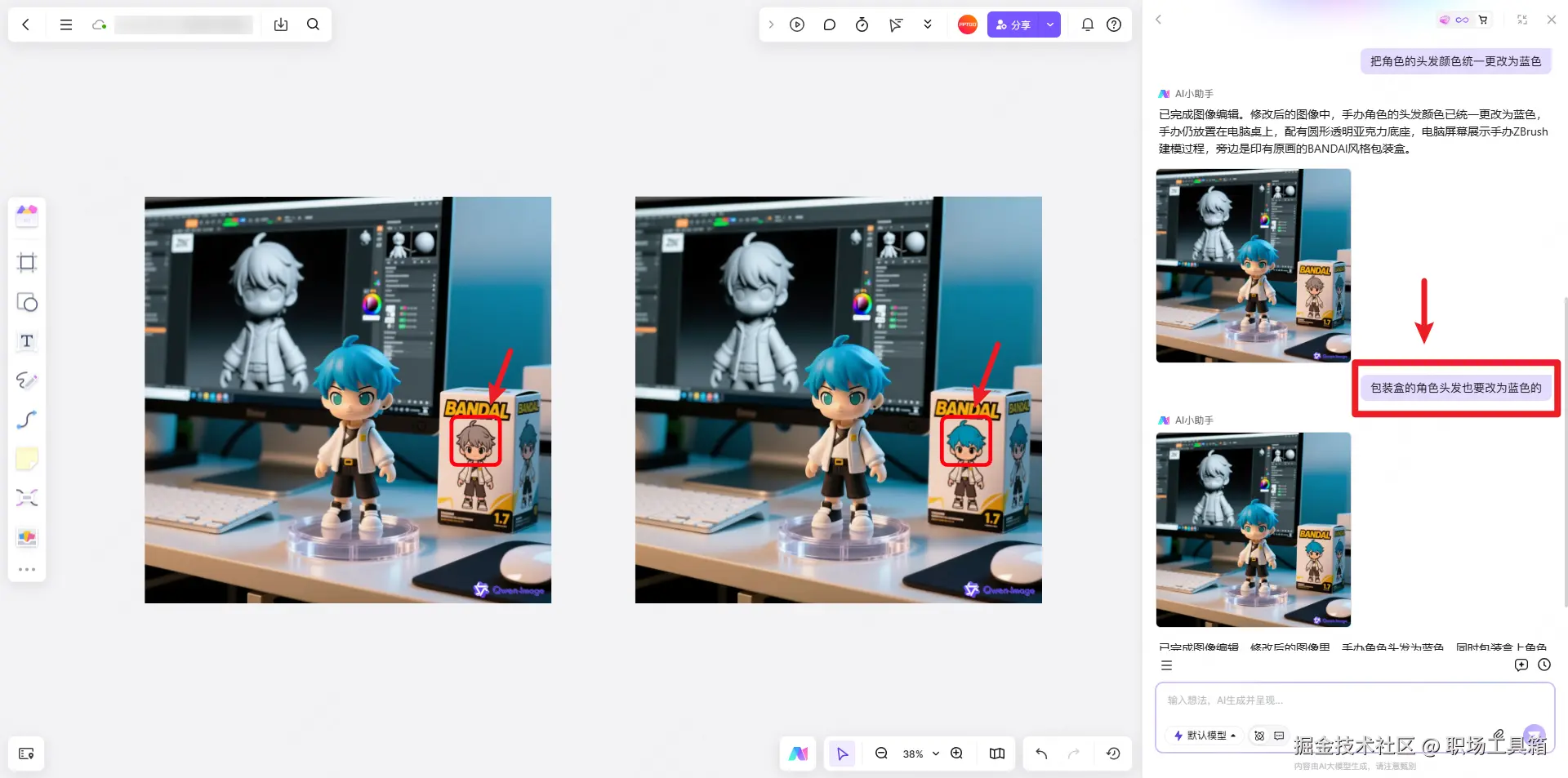 例如笔者在使用boardmix AI绘图的过程中,生成了下图左侧的3D手办模型图片,但存在一个瑕疵,手办盒子的角色头发是灰色的,与主体不一致,这时就可以继续输入提示词,“包装盒的角色头发也要改为蓝色的”,只要输入的指令足够精准,背后的Qwen-image模型也能很好地理解我们的意图,对之前生成的手办模型图片作出相应的调整,返回我们最终想要的效果。