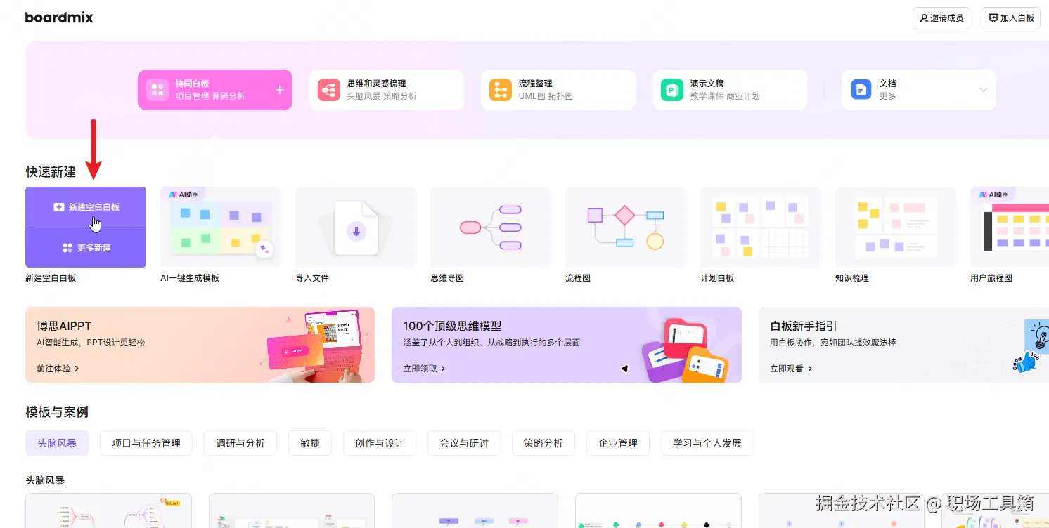 boardmix是一个基于Web的在线协作和可视化呈现平台,使用前需在浏览器打开boardmix首页,进入下图的boardmix工作台,点击“新建空白白板”,新建一个稍后用于放置图片的文件。