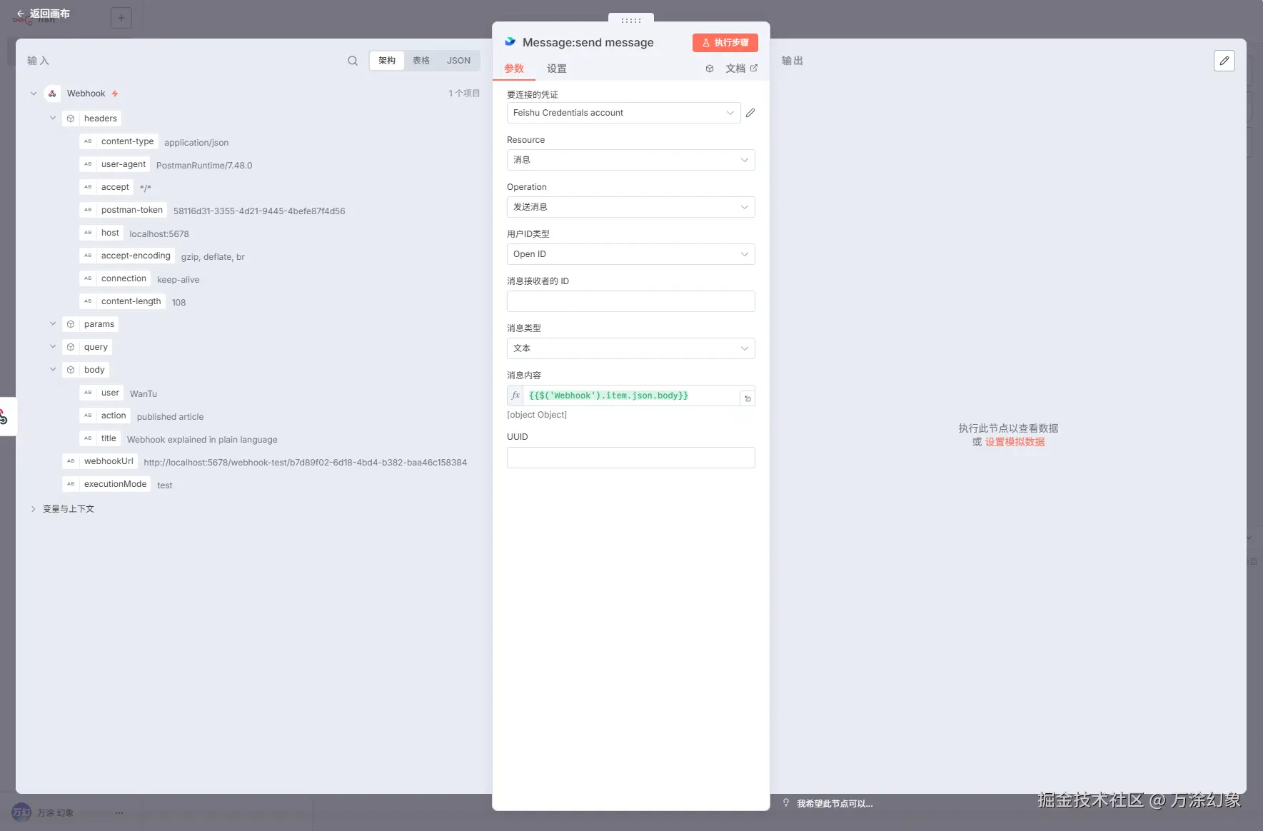 理论、代码、工具都盘完了,咱们最后回归到那个最初的问题场景:“用 n8n 通过 webhook 发送飞书信息”。