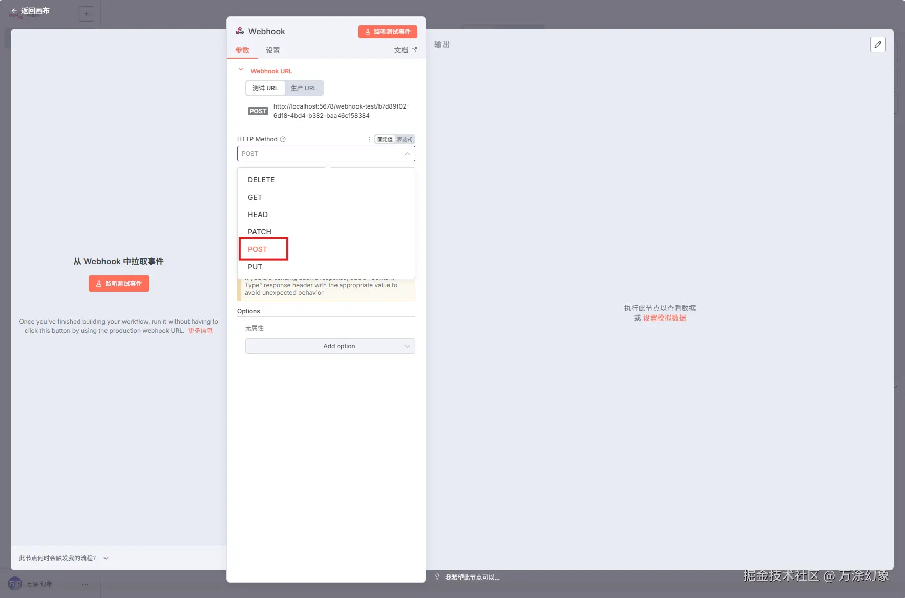 POST请求,把刚才复制的 n8n 的Test URL粘贴进去。