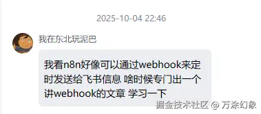 他问:“我看 n8n 好像可以通过 webhook 来定时发送给飞书信息,啥时候专门出一个讲 webhook 的文章学习一下?”