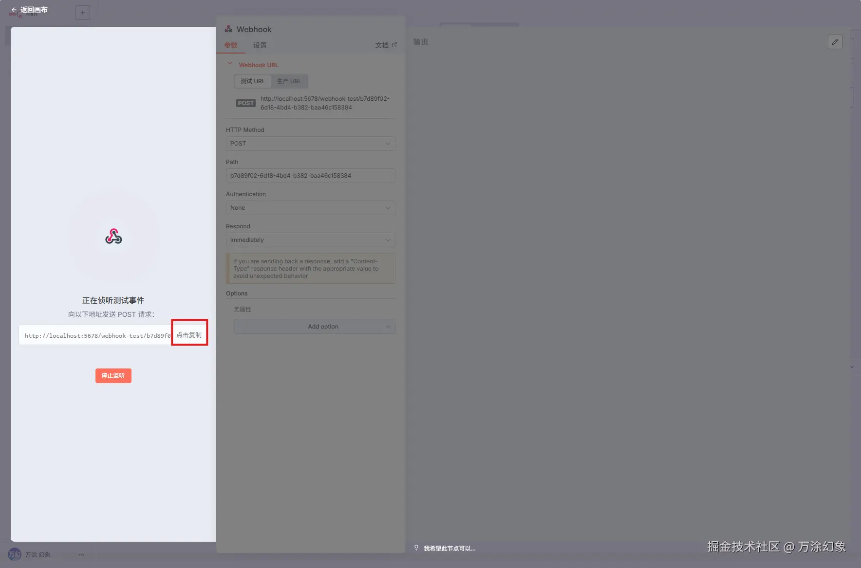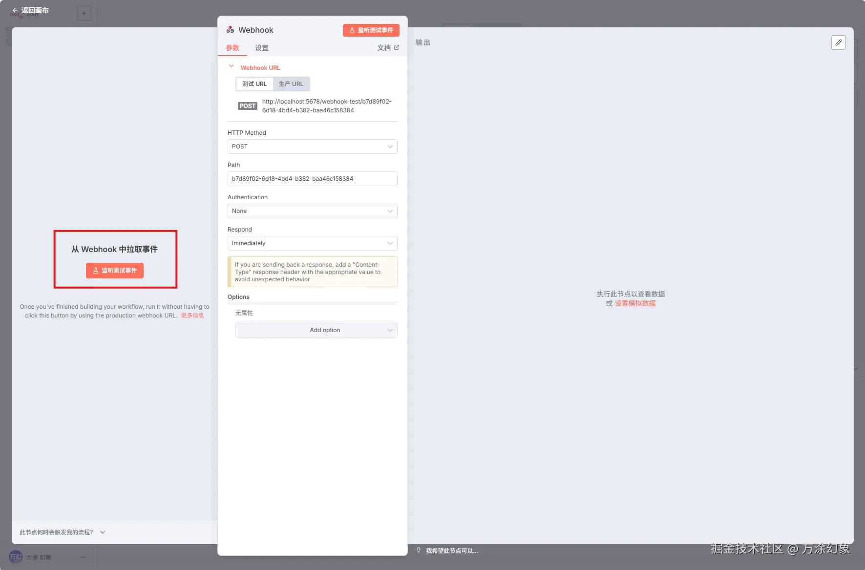 - 关键操作:点击 “Listen for Test Event” 按钮。你会看到它变成了一个等待状态。这个动作,就相当于告诉 n8n:“我准备好了,现在开始竖起耳朵等信号”。