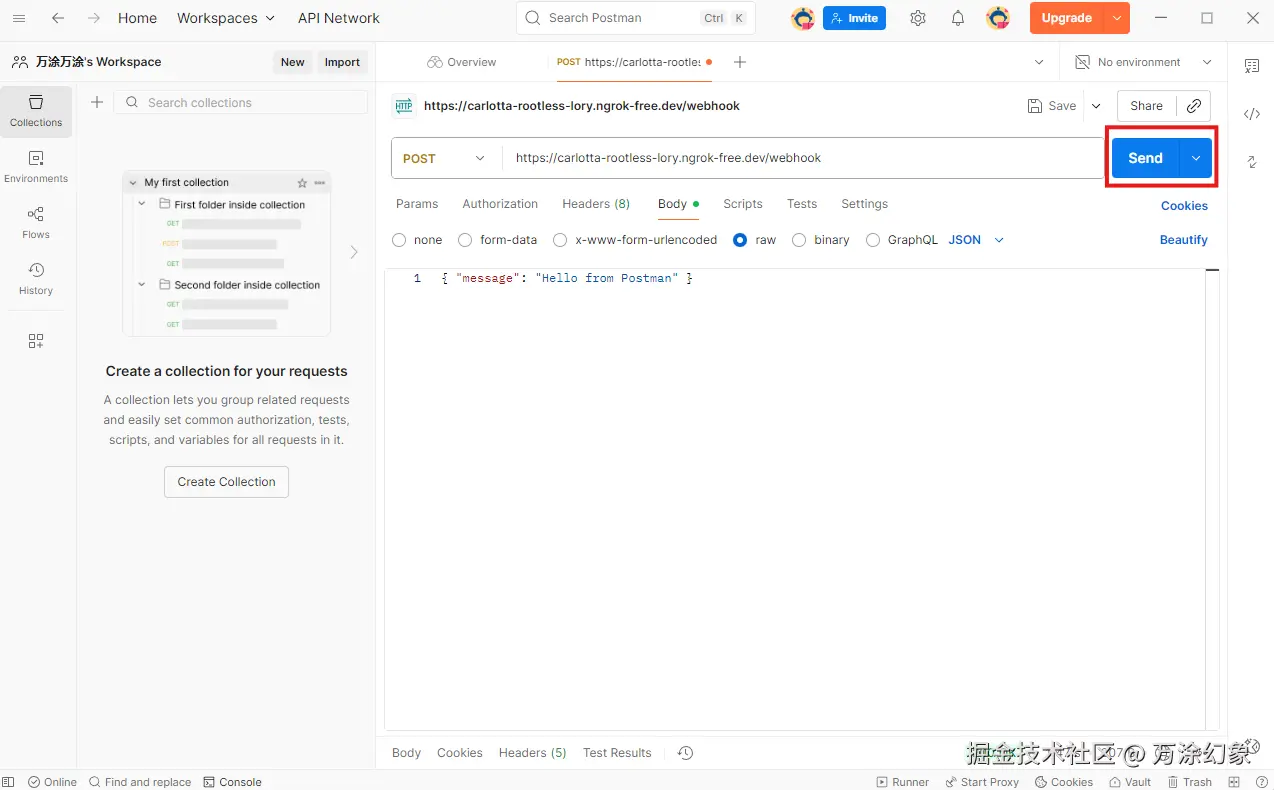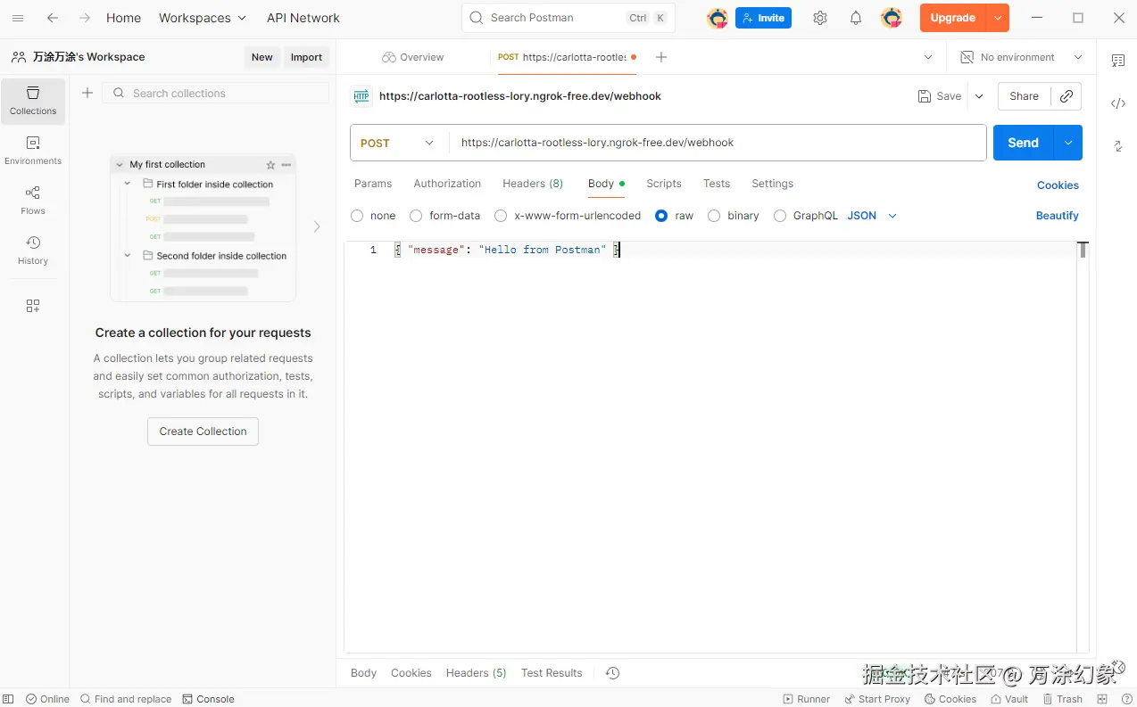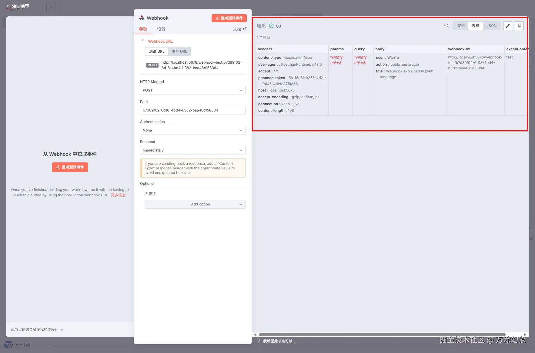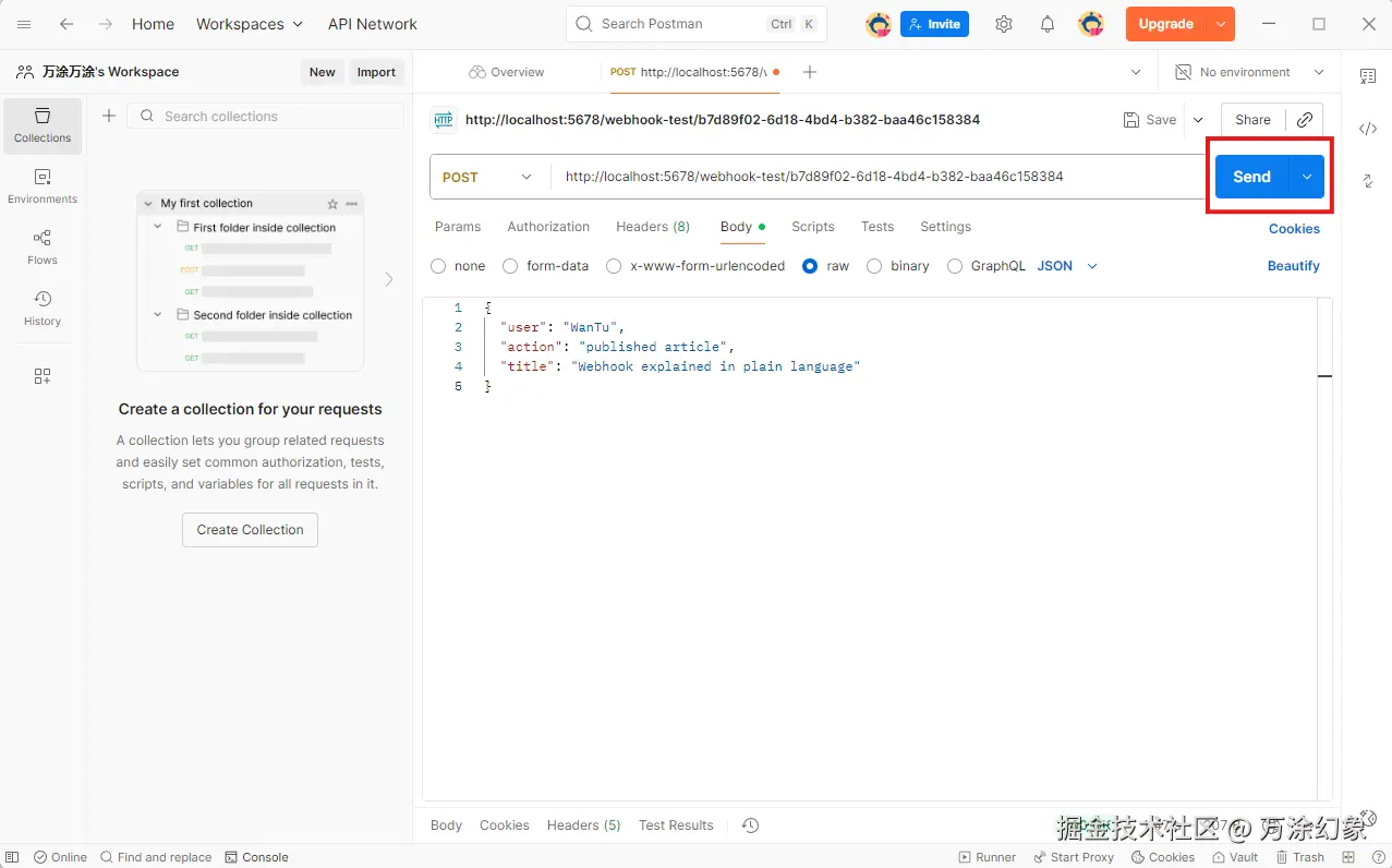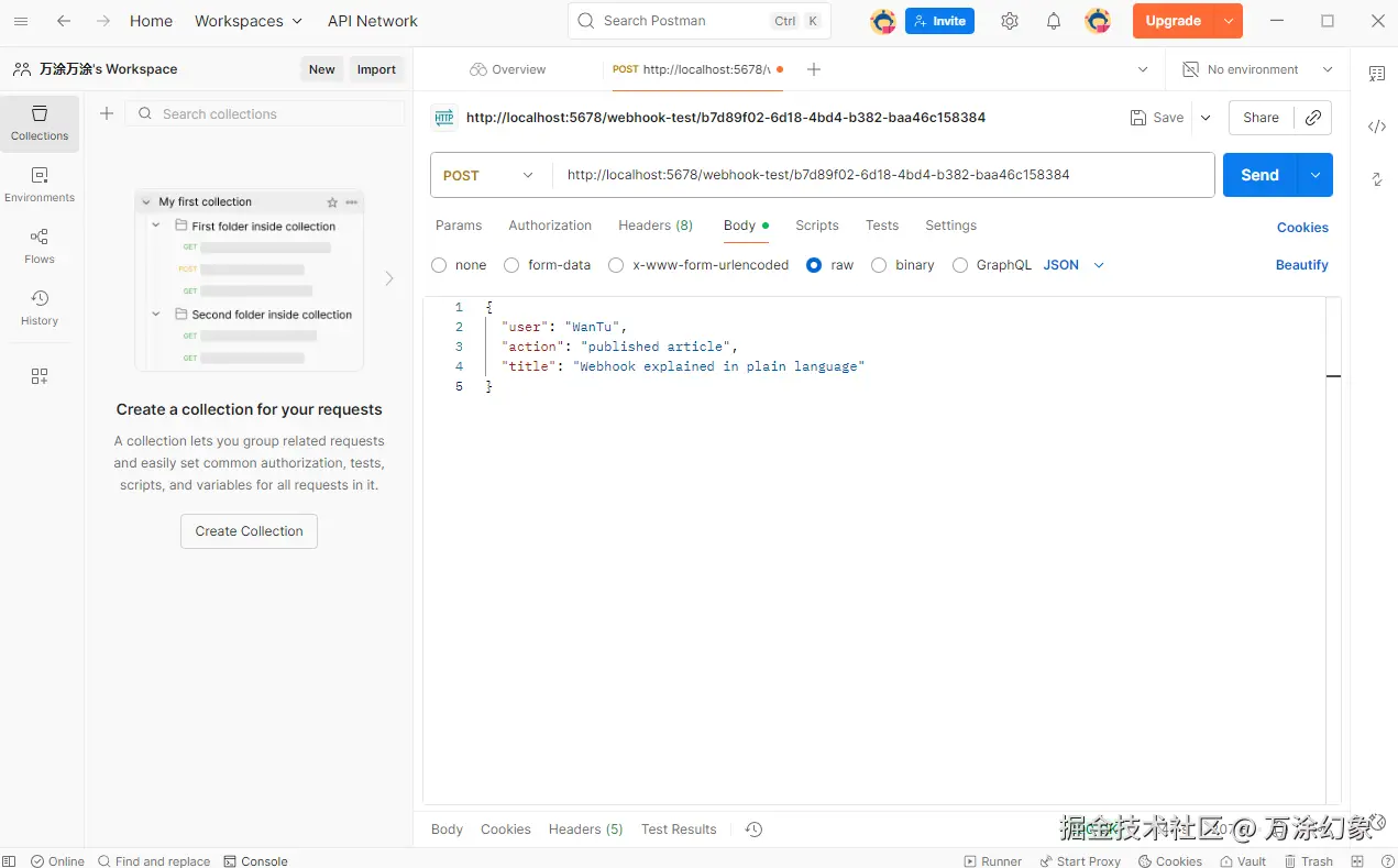 Body->raw->JSON,输入一小段你想传递的 JSON 数据,比如:{ "user": "WanTu", "action": "published article", "title": "Webhook explained in plain language" }