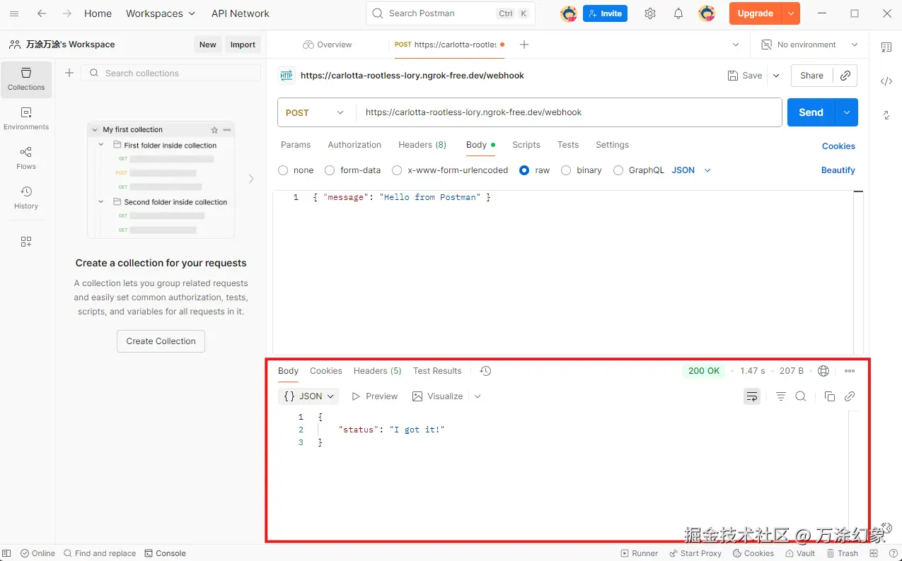 app.py的那个): 你会看到打印出了Received webhook data: {'message': 'Hello from Postman'}的字样。