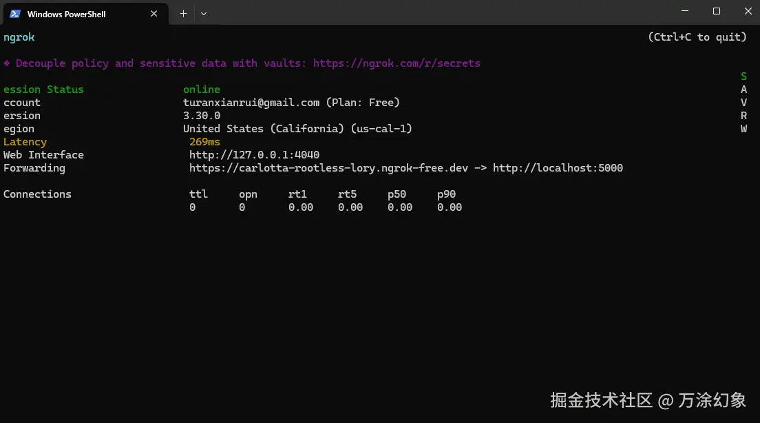 Ngrok 启动后,你的命令行窗口会显示类似下面这样的界面: