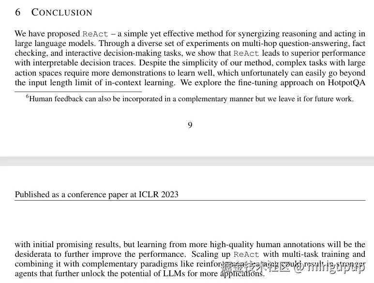 我们提出了ReAct,一种简单而有效的用于在大语言模型中协同推理与行动的方法。通过在多跳问答、事实核查和交互式决策任务上的一系列多样化实验,我们表明ReAct能够带来更优的性能,并产生可解释的决策轨迹。尽管我们的方法很简单,但在动作空间较大的复杂任务中,模型需要更多示例才能良好学习,而这不幸很容易超出上下文学习的输入长度限制。我们在HotpotQA上探索了微调方法,取得了初步的积极结果,但未来仍需依赖更多高质量的人类标注数据来进一步提升性能。通过多任务训练扩展ReAct,并将其与强化学习等互补范式结合,有望催生更强大的智能体,进一步释放大语言模型在更多应用场景中的潜力。
