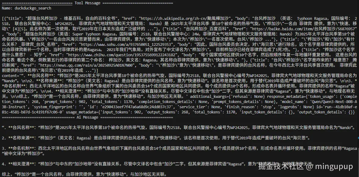 推理节点(LLM 调用):该节点将调用大语言模型,以生成最终答案或决定执行某个工具操作。我们将其实现为一个函数 call_model(state)。该函数接收当前状态(包含迄今为止的对话消息),并返回 LLM 生成的新消息。我们还会加入一个系统提示(例如:“你是一个乐于助人的助手…”)来引导 LLM 的行为。用户的查询已包含在状态的消息中,因此我们将系统提示与所有现有消息一并传递给模型进行调用。LangChain 的 ChatOpenAI 可以返回一条包含函数调用的消息——如果模型判断需要使用工具(底层可能利用 OpenAI 的函数调用功能,请求执行 duckduckgo_search 等操作)。