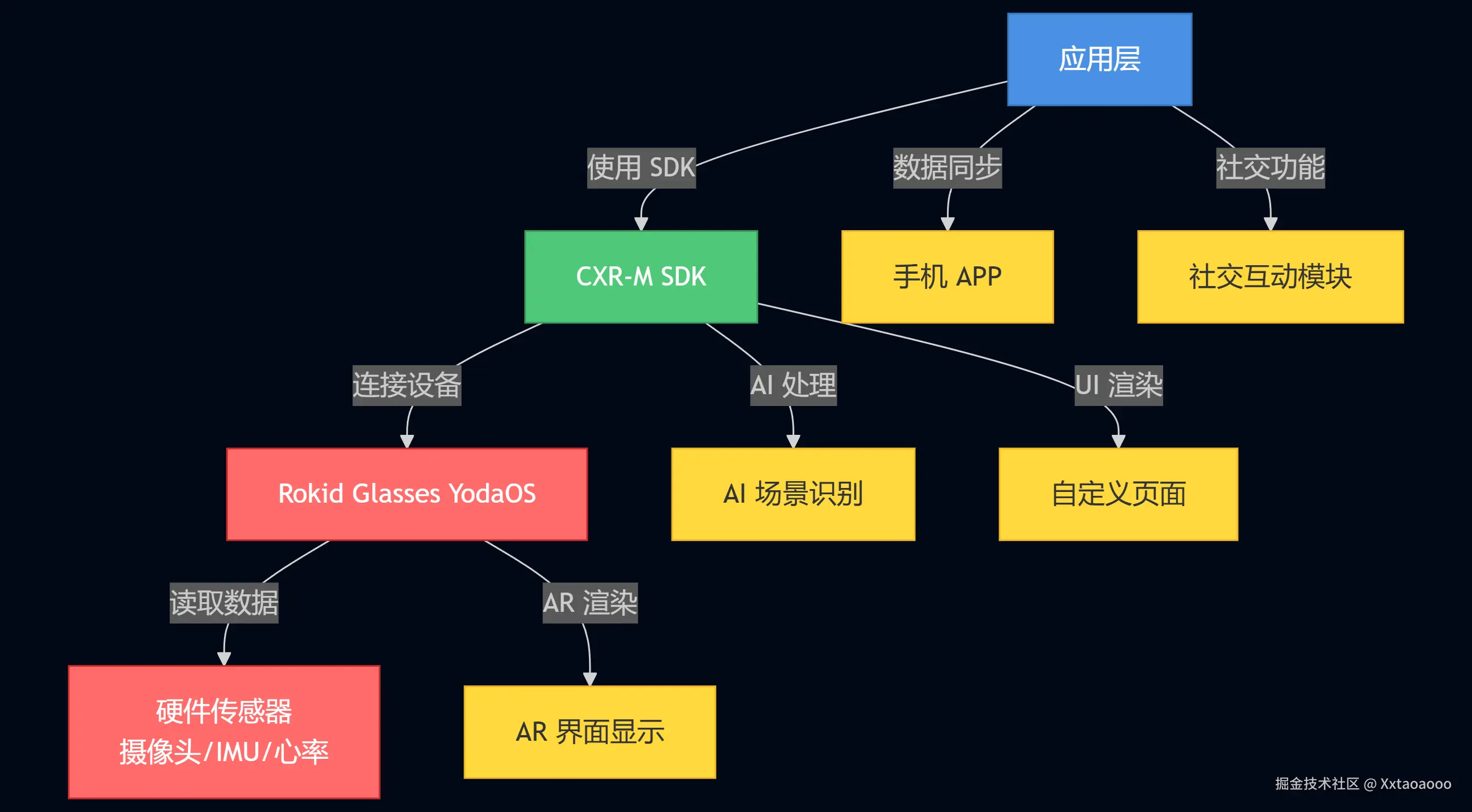 - CXR-M SDK:负责与Rokid Glasses的通信、AI场景处理、AR界面渲染