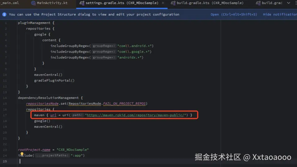 找到settings.gradle.kts,并在dependencyResolutionManagement节点的repositories 中添加Maven仓库。