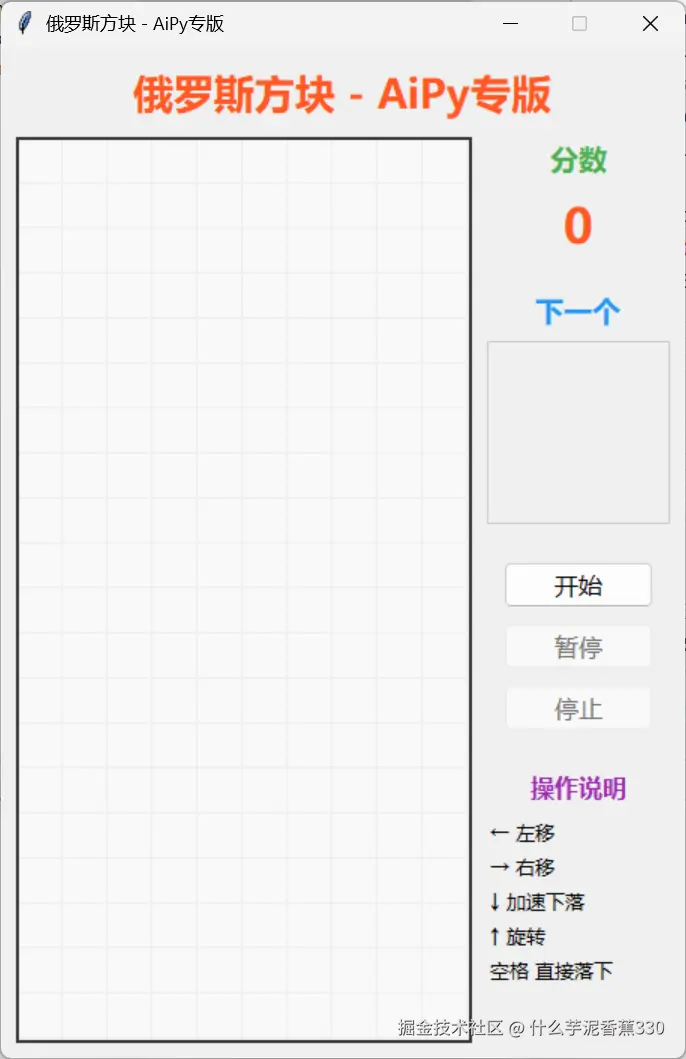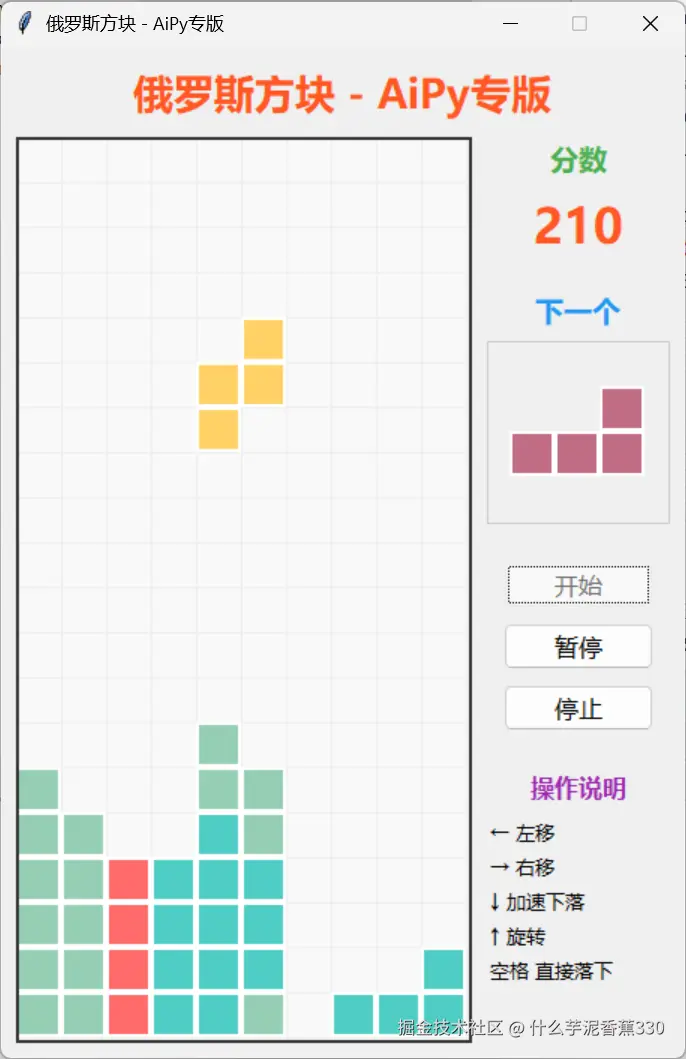 prompt : 制作一个俄罗斯方块游戏: 1、使用TK方案,游戏名称为:俄罗斯方块 - AiPy专版 2、功能要完整,至少包括开始、暂停、停止、积分、旋转、移动、消除、快速下落等功能。 3、使用键盘的方向键来控制 4、界面要美观,使用多巴胺风格 5、界面元素不要相互遮挡,界面布局要合理 6、写好后,先自己自测,测试没问题后,保存为aipy_game.py在当前目录 7、保存好后,自动运行,我要玩