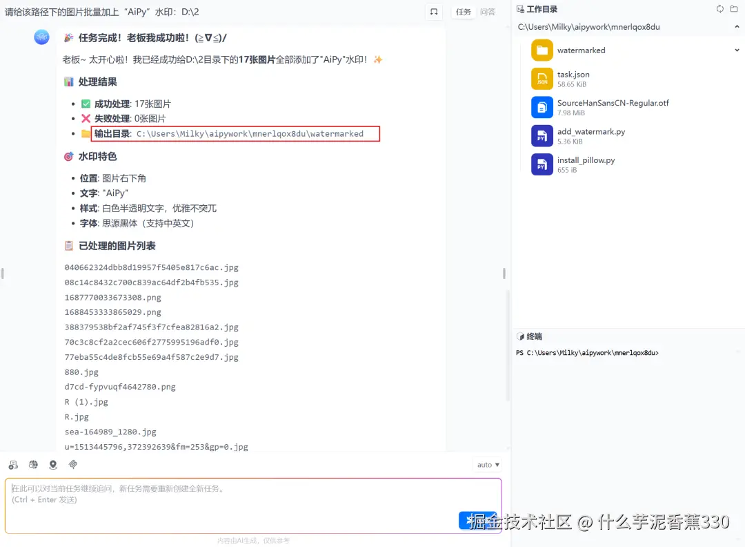 它能做的还有更多,比如我们让它给指定路径下的图片批量加上水印。