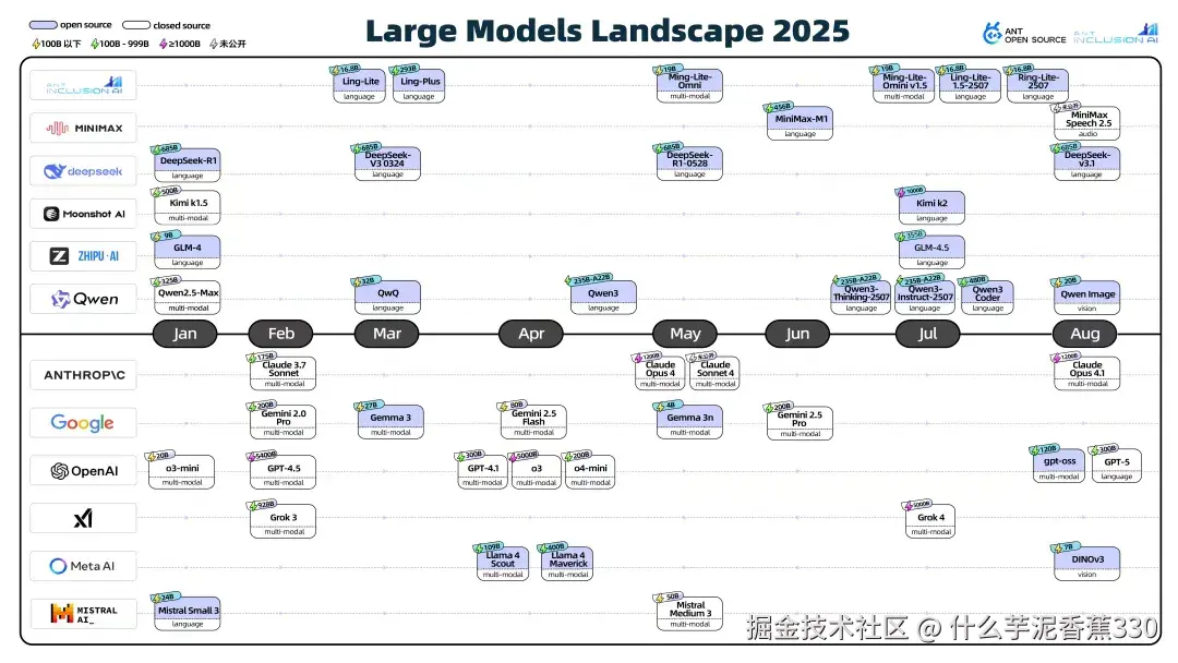 来看 2025 年至今发布的 LLM 统计图。这里统计还只是最好用的那批。