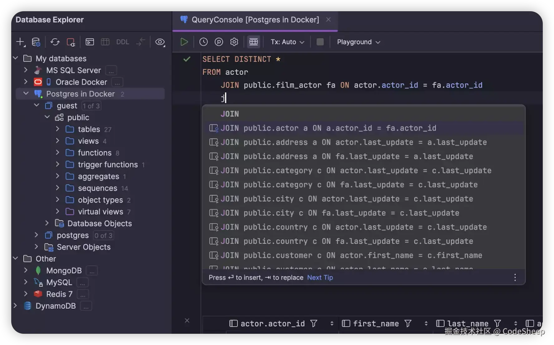 智能编码辅助:DataGrip 继承了 JetBrains IDE 强大的智能代码补全、语法高亮、实时错误检测和代码重构功能,能极大地提升编写 SQL 脚本、存储过程等的效率和准确性。