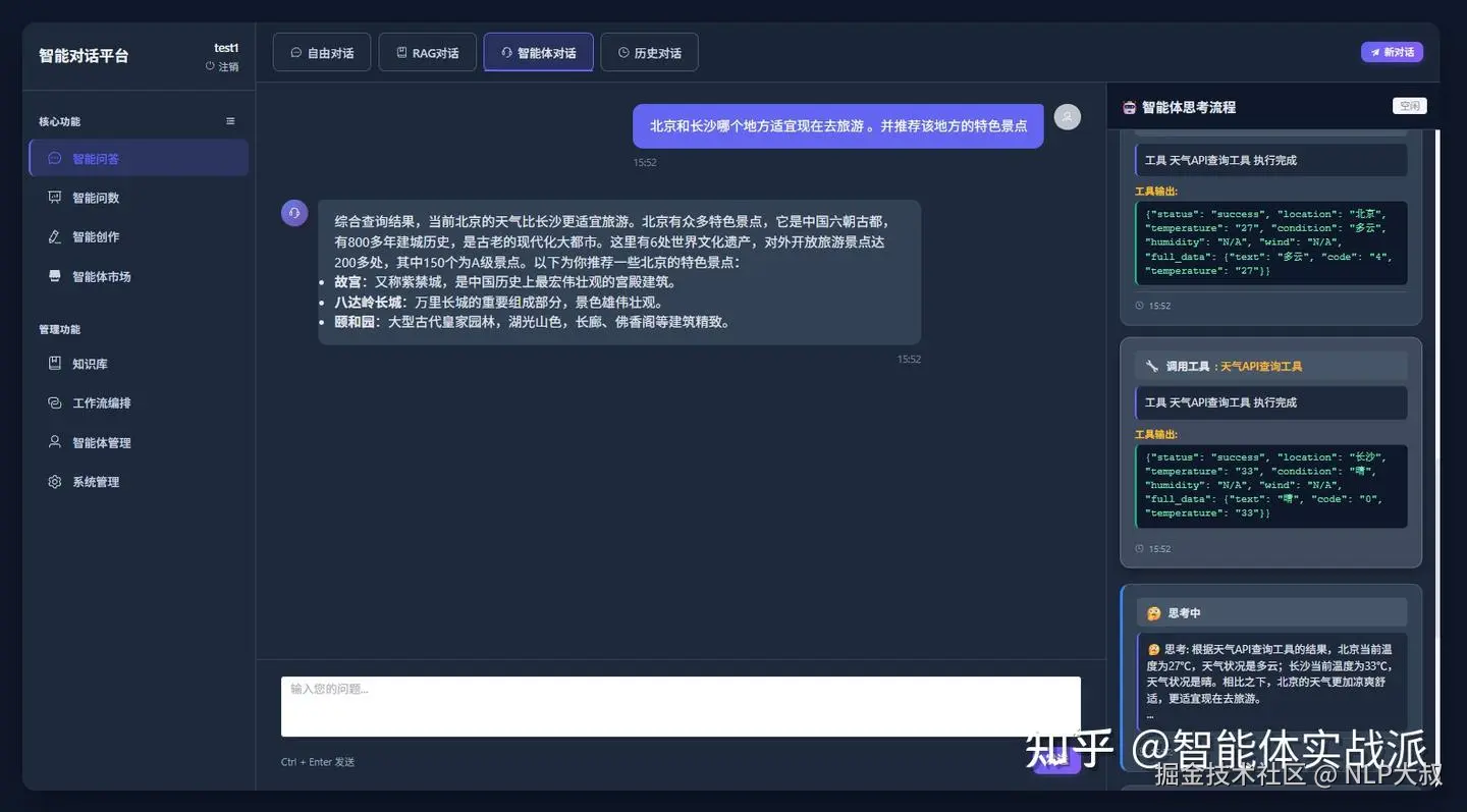 第三步:根据天气判断北京更适合旅游,再调用搜索引擎工具,搜索北京的特色景点。最后将工具调用结果与问题进行总结,完成本次对话过程。