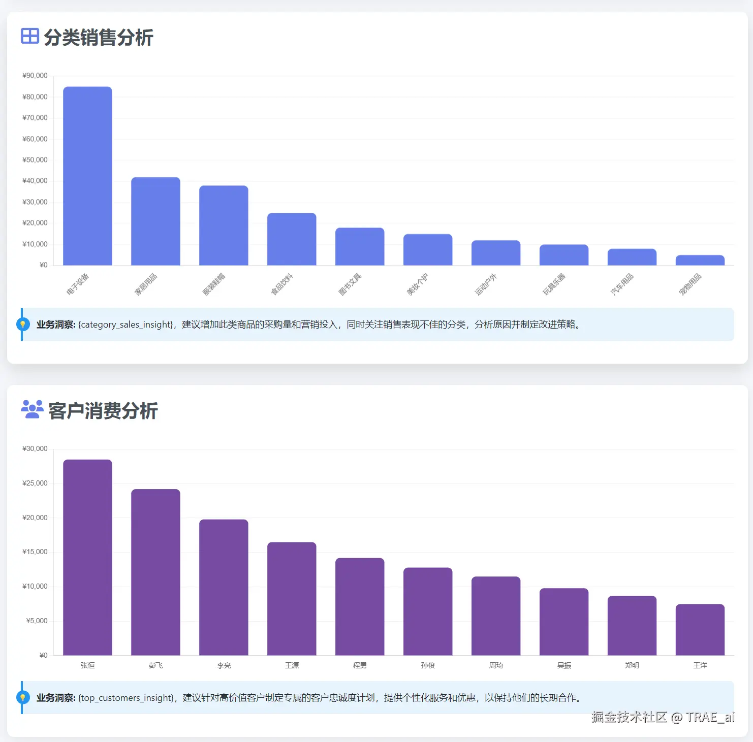 数据分析模块: 执行 SQL 查询,获取分析结果,包括月度销售、分类销售、客户消费等多个维度。封装了核心的数据处理逻辑