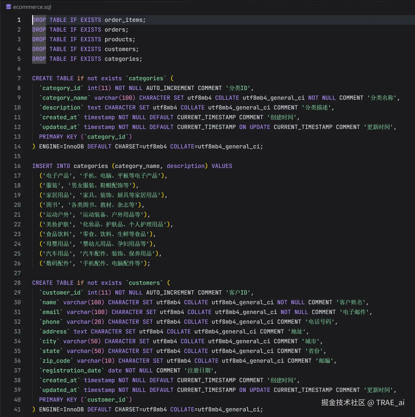 为了进行数据分析,我需要生成一组模拟的电商数据。在 TRAE 的帮助下,我创建了 SQL 数据库操作脚本,用于创建数据库表结构和生成示例数据: