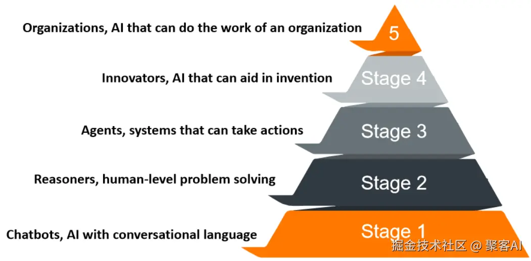 目前,业界对智能体的定义尚未统一。OpenAI的技术路线图为我们提供了一个清晰的参考框架,将大模型的能力划分为五个阶段:
