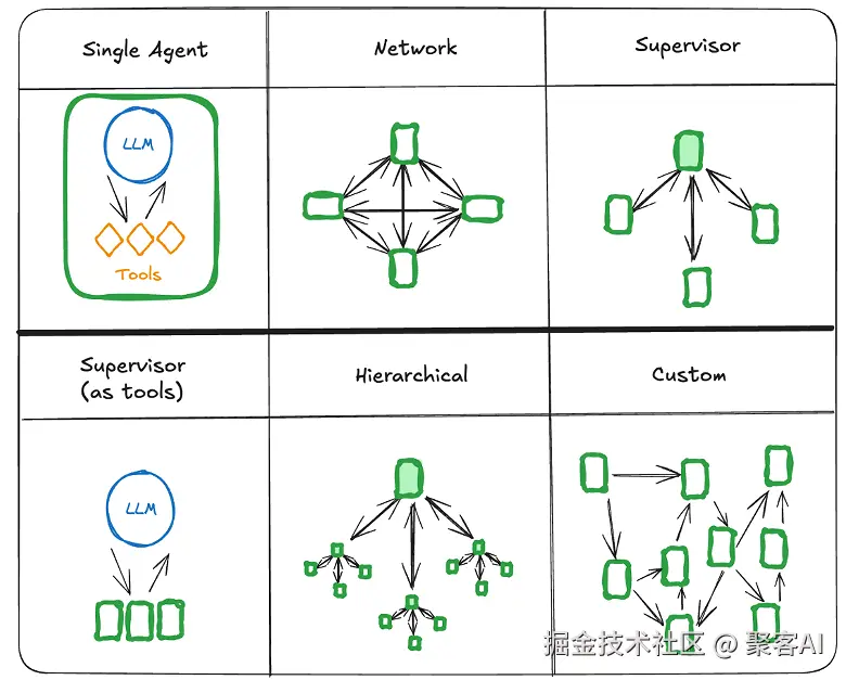 LangGraph是LangChain的扩展,专门用于构建有状态的多步骤工作流(图)。它支持多种多智能体架构模式: