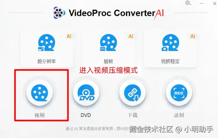 在VideoProc Converter把视频压缩的操作步骤为:选择视频模块导入文件——设置视频压缩的参数——压缩后导出即可。