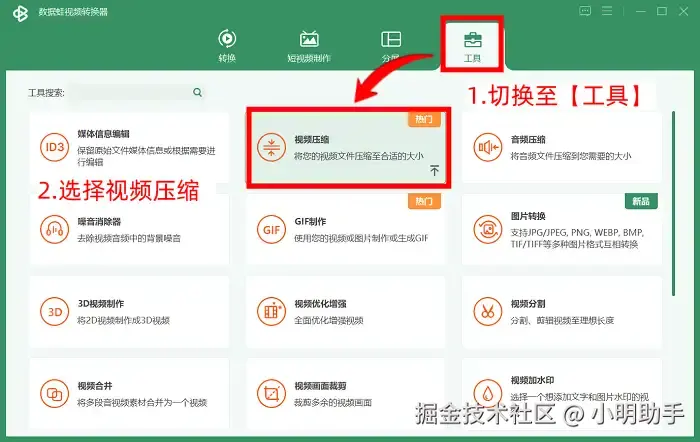 步骤1:在Mac电脑上,下载安装后启动数据 蛙视频转换器,选择顶部【工具】功能模块,再选中下方的【视频压缩】功能,点击即可进入。
