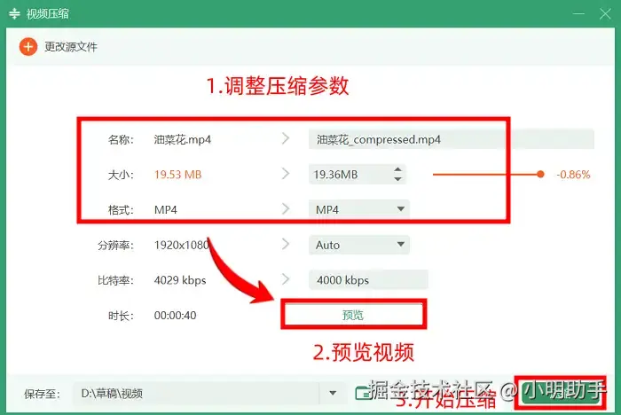 步骤3:根据自己的需求调整视频的大小、分辨率等参数,随后可以使用【预览】功能查看调整后的视频画面,若是满意,则点击【压缩】按钮即可将视频导出。