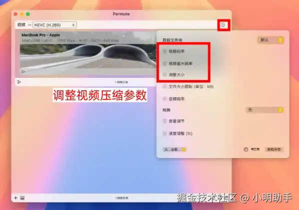 Permute把视频压缩的步骤为:拖入视频文件——选择输出格式,调整质量滑块——开始压缩。