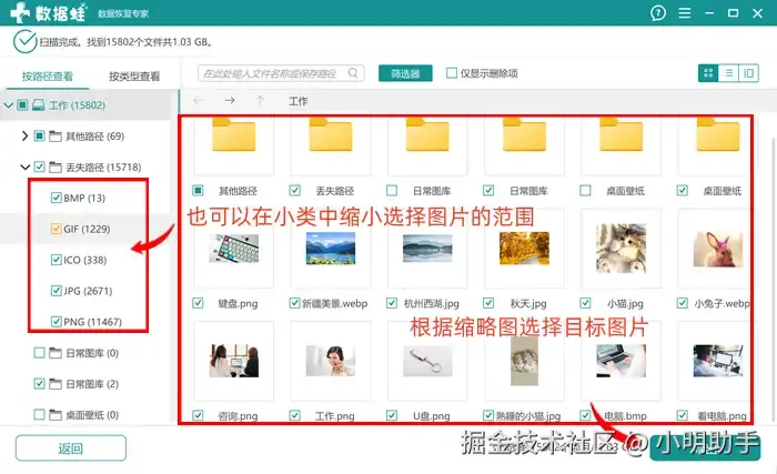 步骤二: 等左上角显示【扫描完成】后,我们可以开始选择需要恢复的图片;我们可以根据缩略图内容选择,也可以在左侧的【目录】选择更细的图片分类,选择好后点击右下角的【导出】;