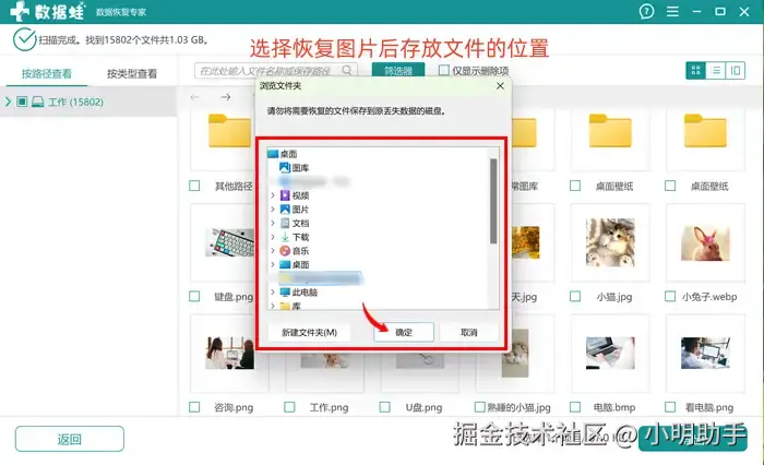 步骤三: 点击【导出】按钮后,我们还需要在【浏览文件夹】中为恢复的图片选择存放的位置。