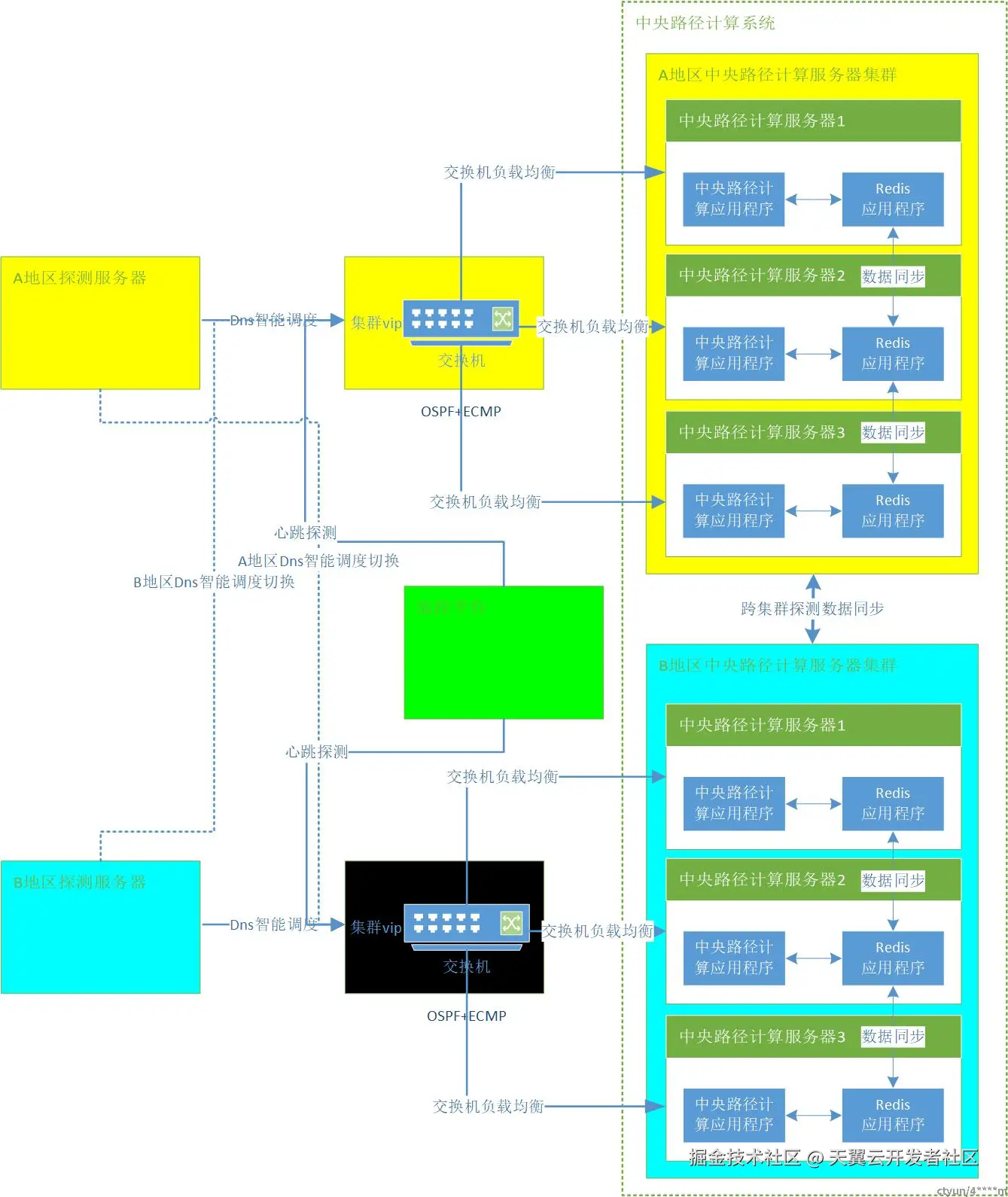 3)监控平台定时采集探测A、B等多个地区的中央路径计算服务器集群vip的心跳探测请求结果,dns智能调度平台获取每个地区的中央路径计算服务集群的心跳探测结果,一旦发现就近调度的中央路径计算服务集群vip的心跳探测失败,则dns智能调度切换到其他正常服务的中央路径计算服务集群;