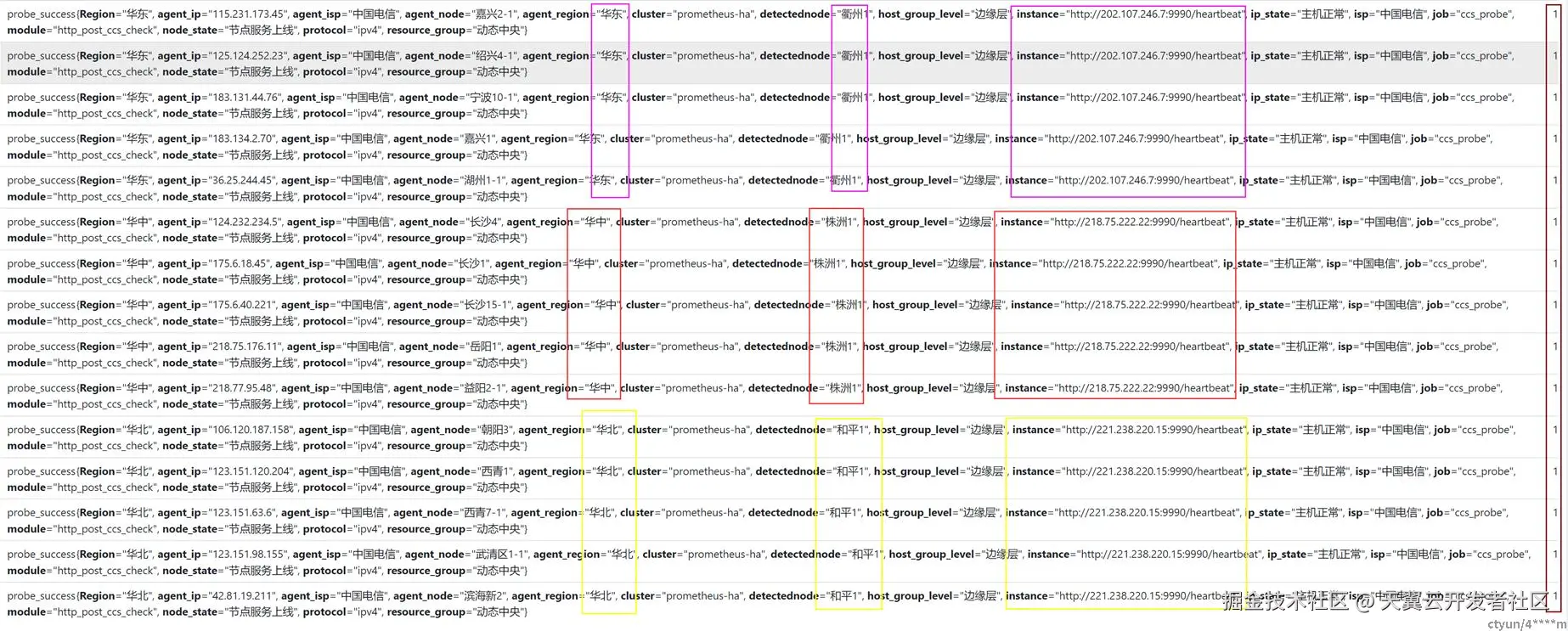 下图所示为监控平台定时采集的华东-衢州、华中-株洲、华北-和平3个地区的中央路径计算服务器集群vip的心跳探测请求结果,ccs_probe探测结果为1表示集群服务正常,为0表示集群服务异常。