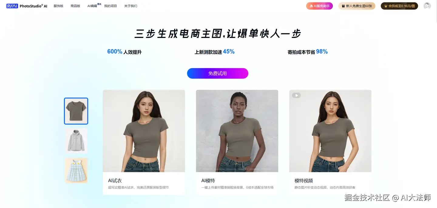 | PhotoStudio AI | 服装、商品展示 | 虹软视觉大模型驱动,提供多风格模特库和场景模板,一键生成专业摄影效果 | ★★★★☆ |