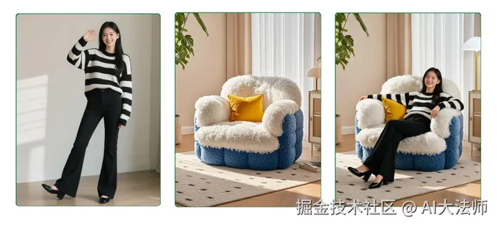 消费者在电商平台购物时,“真人试穿/试用图”的转化效果比纯产品图要高个3-5倍。尤其是在服装、美妆、家居这些品类里,用户需要看到“衣服穿在人身上是否合身”“口红涂在唇部是否与肤色匹配”“家具摆在家里的是否搭配”。AI生成的真人图,恰好能满足这种“代入感”的需求。