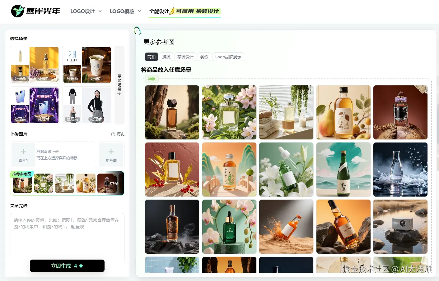 - 复刻大牌风格:上传大牌广告图,快速生成同等质感和风格的商品图。