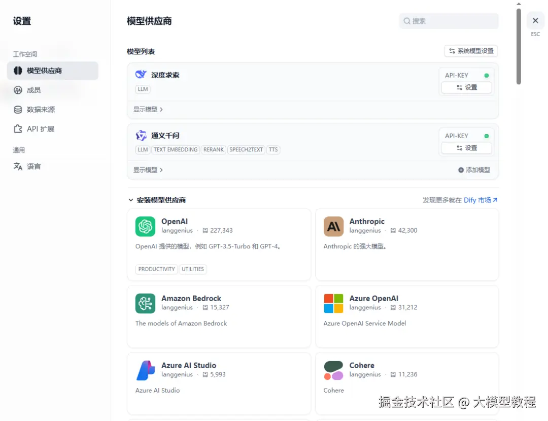 在“设置”—“模型供应商”中自定义配置所需的大模型API-KEY,类型包括Chat、Text Embedding、Rerank模型。