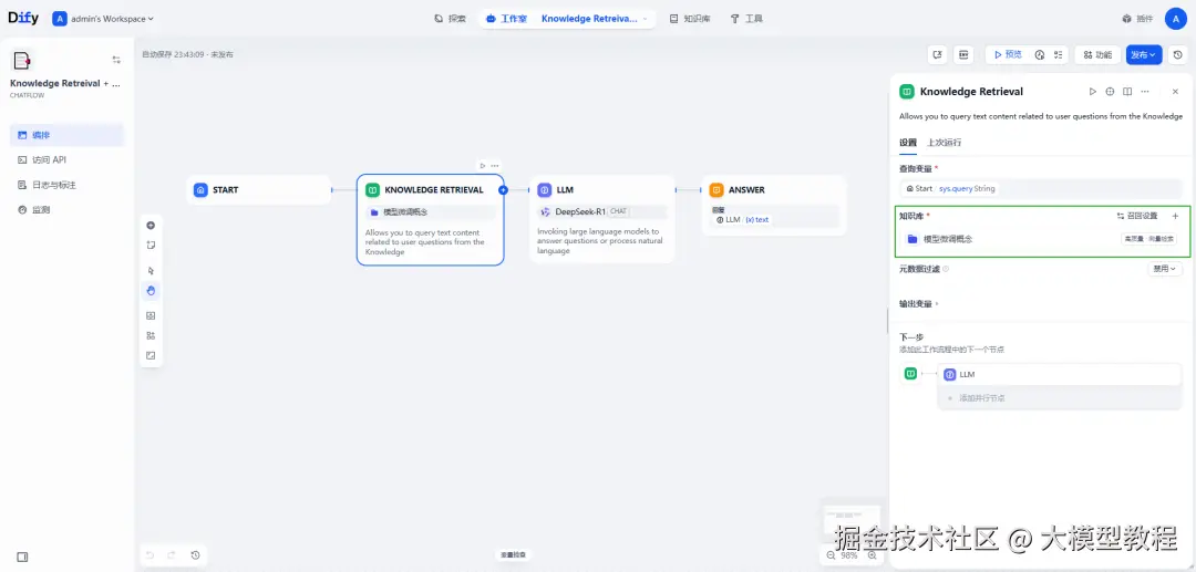 在“LLM”组件中设置模型类型及将知识库检索结果作为上下文: