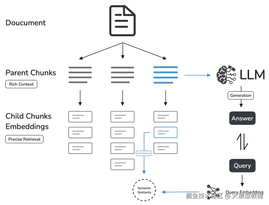 - 将包含匹配子分段的更大部分(如段落、章节甚至整个文档)视作父分段并提供给大语言模型(LLM)。