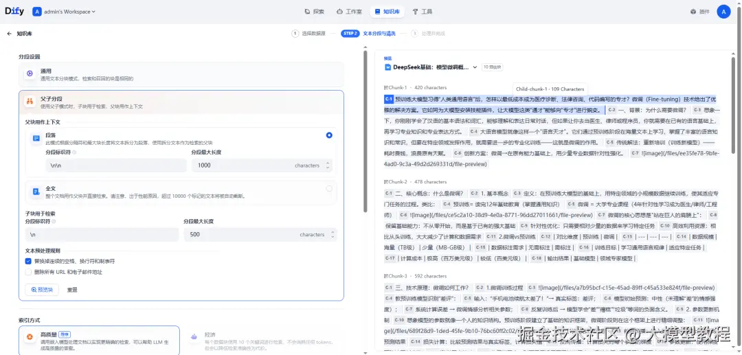 配置完成后,点击“预览区块”即可查看分段后的效果。可以查看父分段的整体字符数。背景标蓝的字符为子分块,同时显示当前子段的字符数。