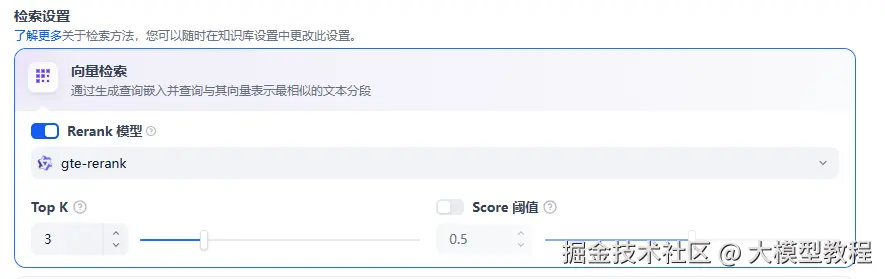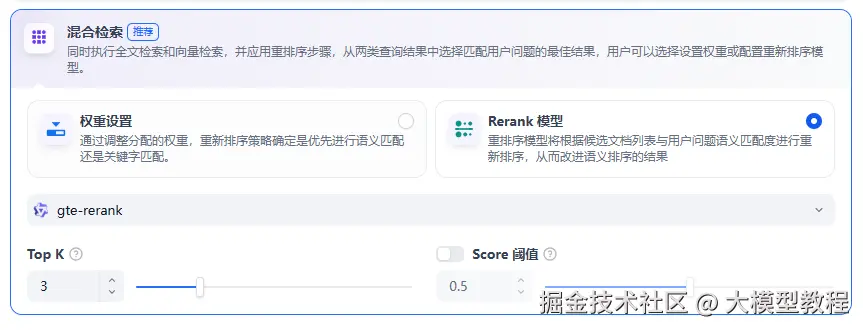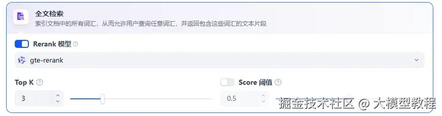Rerank模型:默认关闭。开启后将使用第三方Rerank模型再一次重排序由全文检索召回的内容分段,以优化排序结果。向LLM发送经过重排序的分段,辅助其提升输出的内容质量。