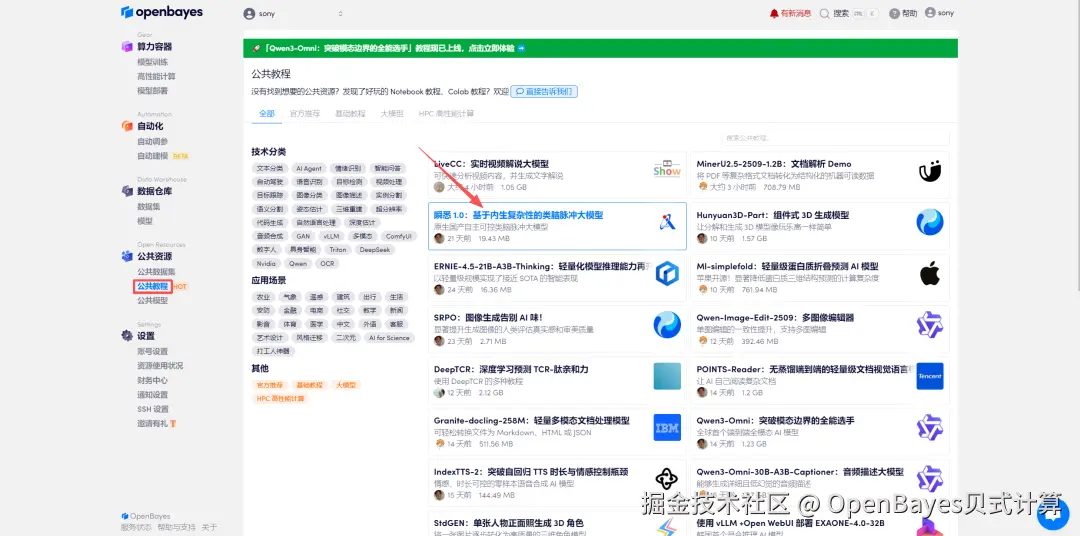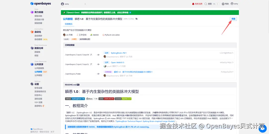 1.登录 OpenBayes.com,在「公共教程」页面,选择「瞬悉 1.0:基于内生复杂性的类脑脉冲大模型」教程。