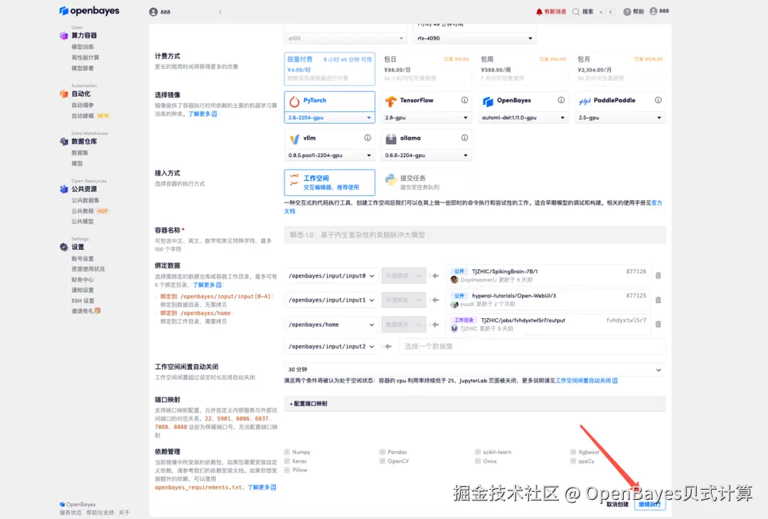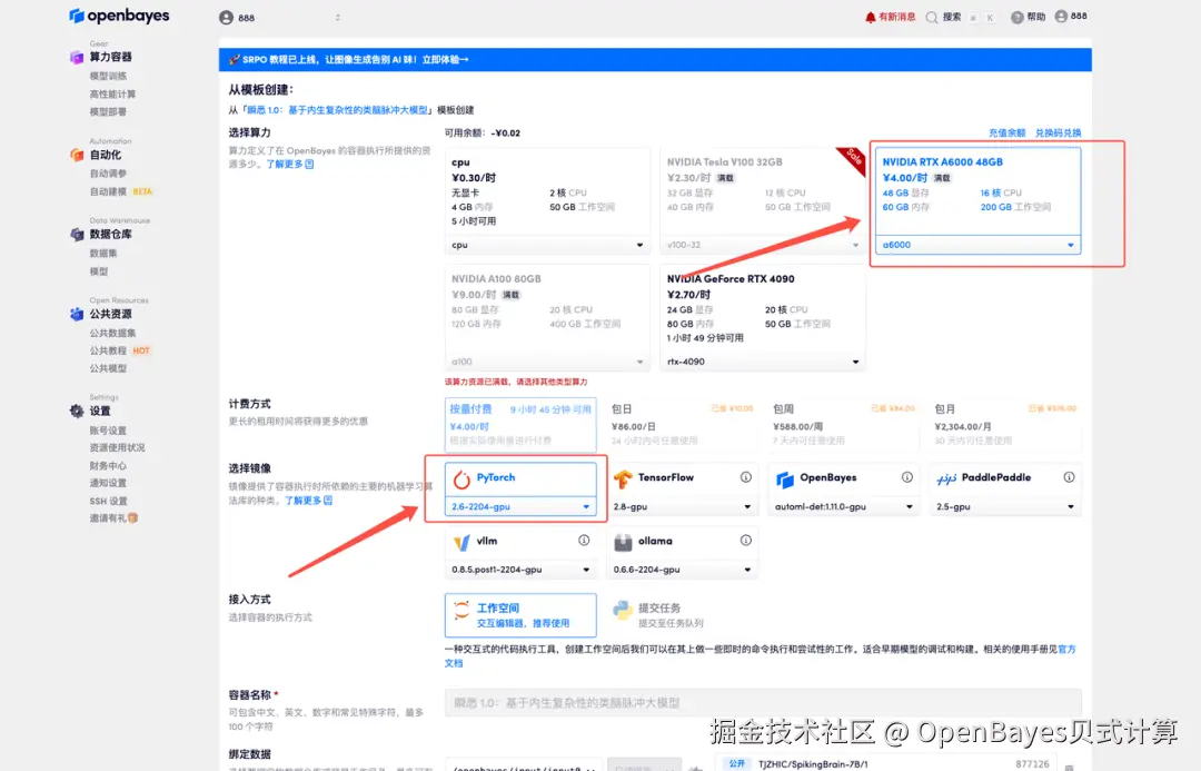 3.选择「NVIDIA RTX A6000 48GB」以及「PyTorch」镜像,按照需求选择「按量付费」或「包日/周/月」,点击「继续执行」。新用户使用下方邀请链接注册,可获得 4 小时 RTX 4090 + 5 小时 CPU 的免费时长!
