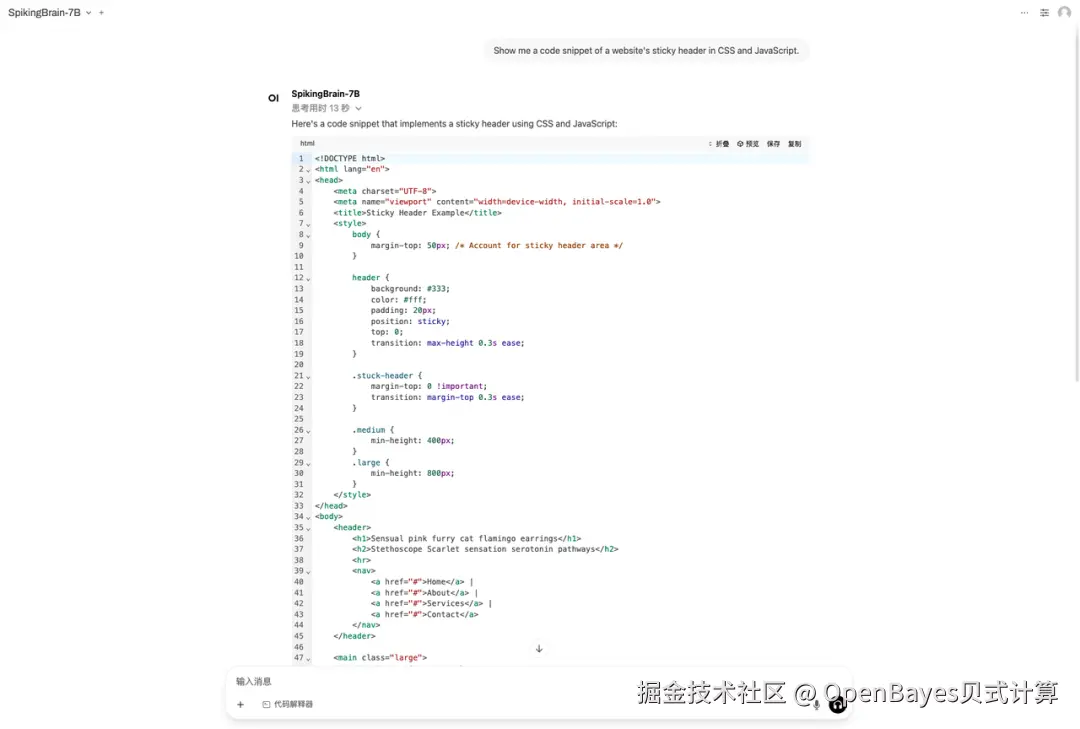小贝以「Show me a code snippet of a website's sticky header in CSS and JavaScript.」为例进行提问,效果如下图所示:
