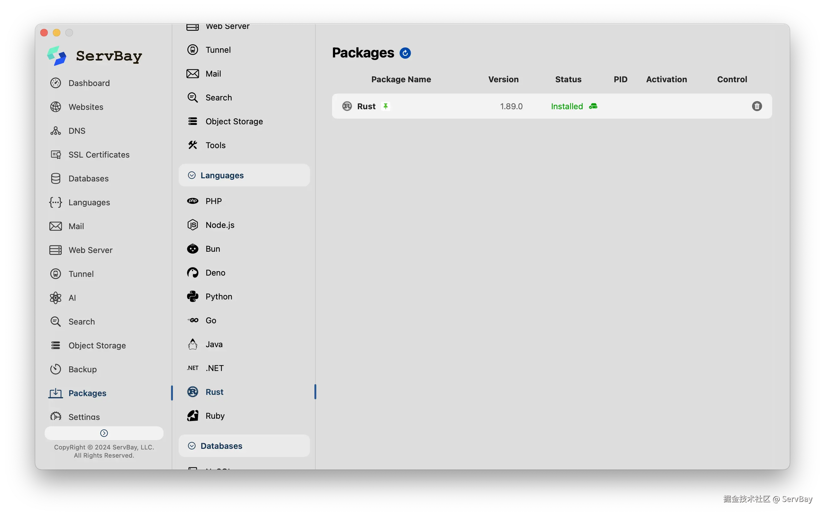 我推荐使用ServBay,这是开发环境的全家桶,想安装啥,直接勾选就行。Rust、Nginx、数据库、Redis,一键安装好Rust,版本管理得明明白白。再也不用自己去网上搜教程、手动敲命令了。它把这些烦人的准备工作都干了,我们就能踏踏实实地写代码。如果你也觉得配环境头大,真心可以试试这个。
