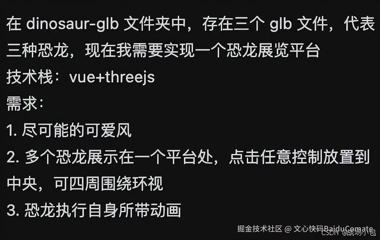 比想象中快很多,大约等了5-6分钟,运行项目,竟然一次成功啦! 预想是三次交互能成功就非常不错了,结果也令人惊喜,而且还做了一些舒适的细节处理,比如展示台和空中的移动云朵效果等。文心快码3.5S,首先检查了dinosaur-glb文件夹下模型的大小和信息,并编写脚本将模型同步到了public/assets中:
