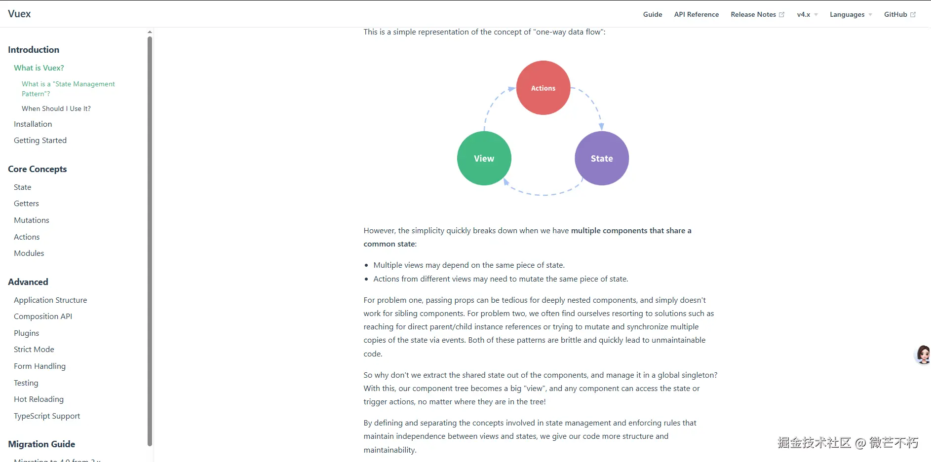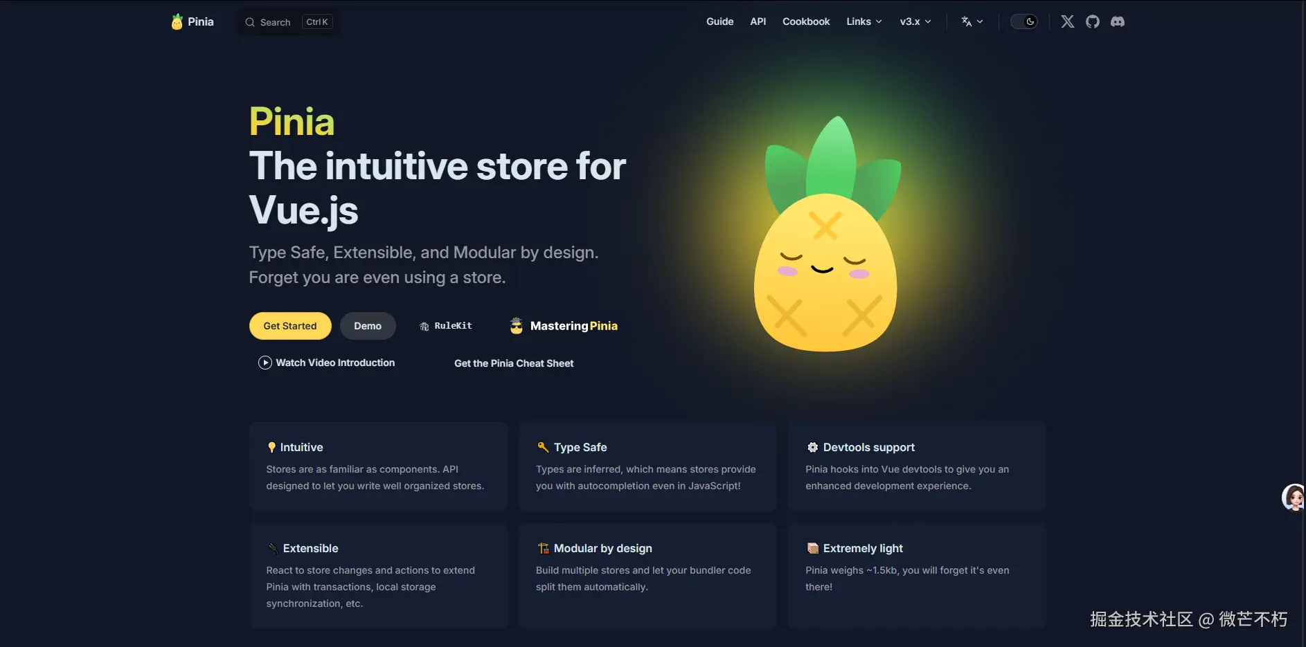 和早期的 Vuex 相比,它去掉了 mutations 这类相对冗余的概念,API 更简洁,我们甚至能直接在组件外部调用和修改状态,使用起来更灵活。