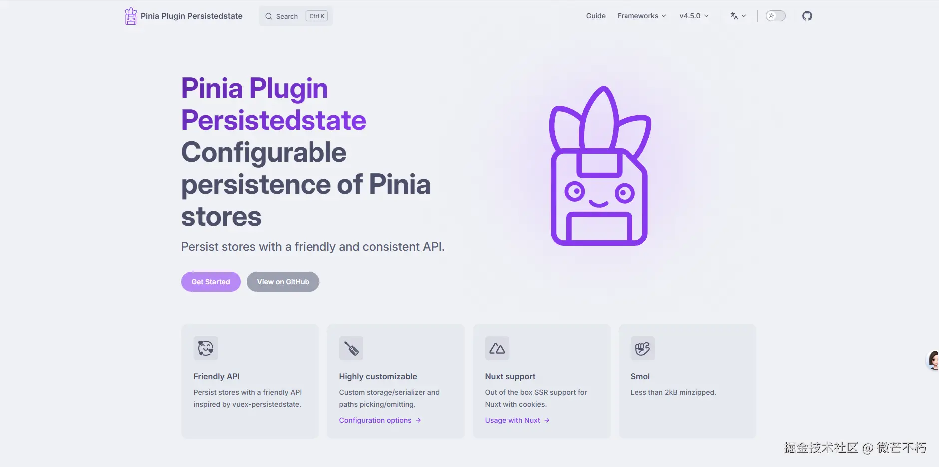 这是 Pinia 的官方推荐持久化插件。我们知道,Pinia 管理的状态默认在页面刷新后会丢失,而这个插件能帮我们自动把状态存储到 localStorage、sessionStorage 等地方,无需手动编写存储逻辑。